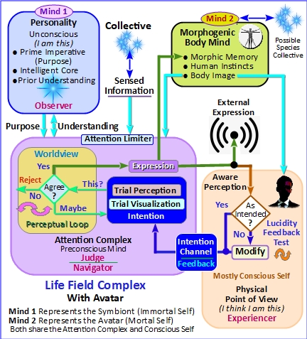 - An Experiencing Agent – This functional area perceives and tests the understanding expressed by the Meaningful Agent and produces an Intention feedback signal to moderate worldview. This is the life field’s aware or conscious In terms of Figure 1, this is Layer 3 – Intention (conscious) function.