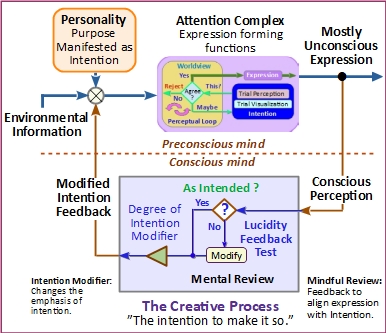 - Layer 3 represents conscious (aware) self. Its function is to perceive and develop conscious awareness of the expression output of Layer 2. This functional area includes a “Is this what I intend (want)?” decision that produces a feedback signal that may modify worldview. See “Conscious Self and Creative Process” (Figure 3)