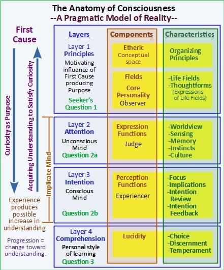- As shown in The Anatomy of Consciousness Diagram (Figure 1) reality is modeled as for Layers: I.) Principles, 2.) Attention, 3.) Intention, 4.) Comprehension. Layers 2 and 3 represent “Implicate Mind” illustrated in Figure 2.